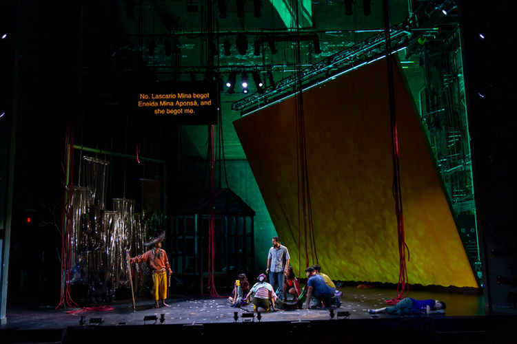 This show used shadow and projection elements, the drop was sized and ultimately based with supersats and water-down Off broadway Rosco paint.